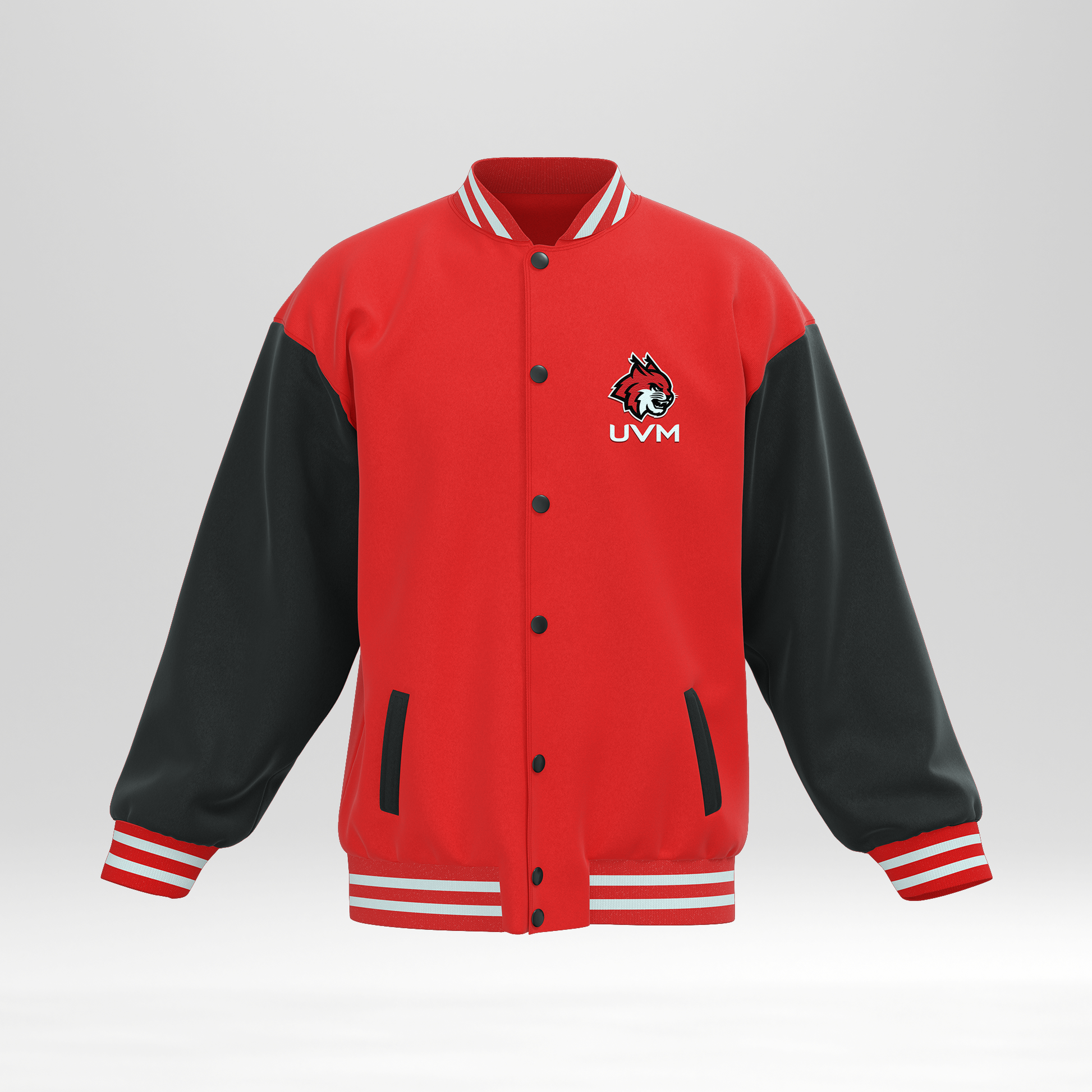 Chamarra universitaria roja con mangas negras UVM logo linces